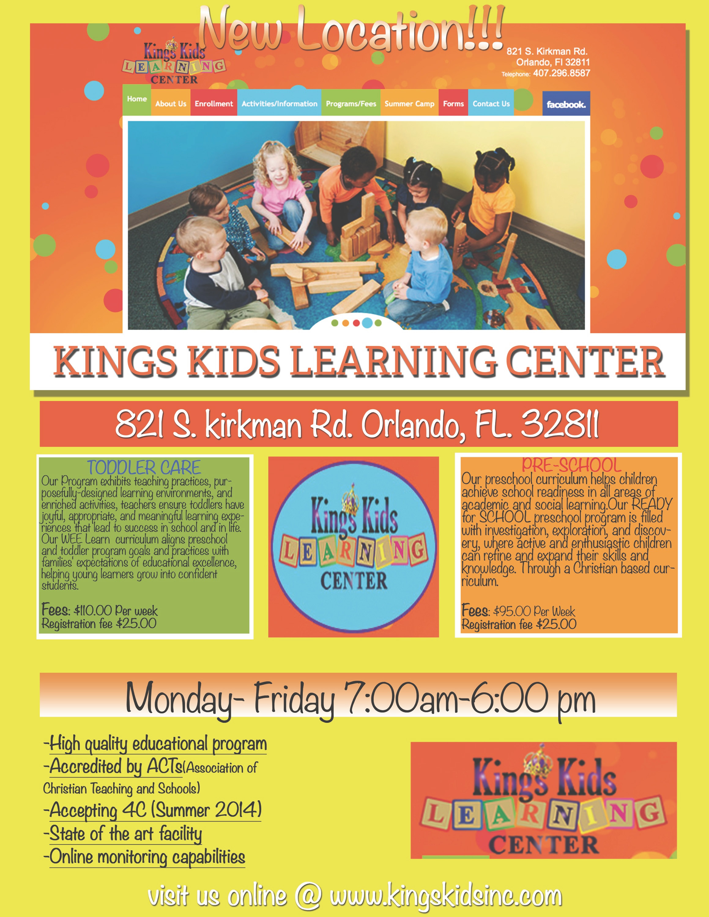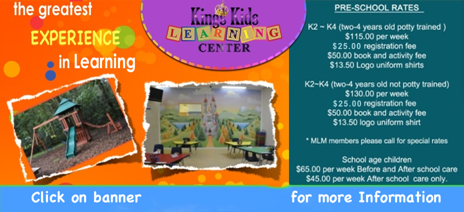 King's Kids Day Care Center is a non-profit Christian base child care program. Our goal is to provide an atmosphere that encourages tenderness, peace and love. Our curriculum is designed to focus on the different developmental needs of children ages 5 months through 10 years. Daily lessons include, but are not limited to, gross motor activities, academics ( Language Arts, Math, Reading Readiness, Arts/Crafts, Music ) for pre-school levels, Bible lessons and quiet play.